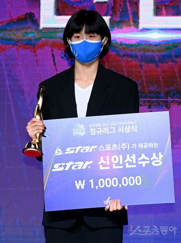 28일 서울 여의도 63컨벤션센터에서 열린 ‘삼성생명 2021-2022 여자프로농구’ 정규리그 시상식에 참석한 삼성생명 이해란이 신인선수상을 수상한 뒤 기념촬영을 하고 있다.
