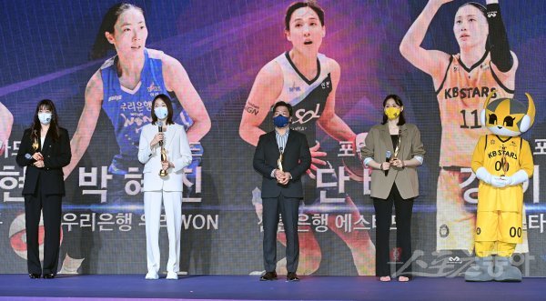 28일 서울 여의도 63컨벤션센터에서 열린 ‘삼성생명 2021-2022 여자프로농구’ 정규리그 시상식에 참석한 신지현, 박혜진, 김단비(대리수상 김태경 사무국장), 강이슬, 박지수(대리수상 마스코트)가 베스트5에 선정되어 기념촬영을 하고 있다.