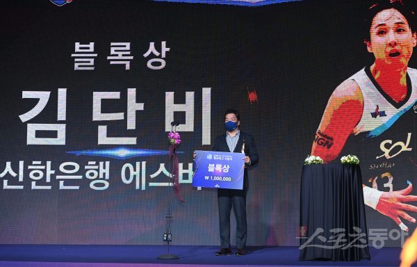 28일 서울 여의도 63컨벤션센터에서 열린 ‘삼성생명 2021-2022 여자프로농구’ 정규리그 시상식에 참석한 신한은행 김단비(대리수상 김태경 사무국장)가 블록상을 수상한 뒤 기념촬영을 하고 있다.