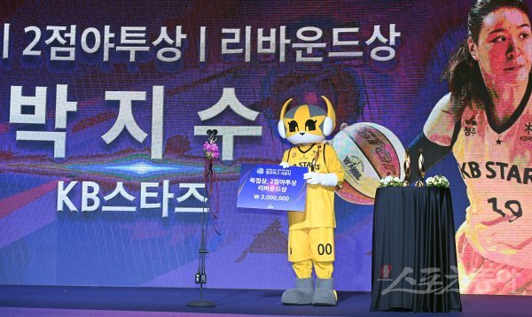 28일 서울 여의도 63컨벤션센터에서 열린 ‘삼성생명 2021-2022 여자프로농구’ 정규리그 시상식에 참석한 KB스타즈 박지수(대리수상 마스코트)가 득점상, 2점야투상, 리바운드상 수상한 뒤 기념촬영을 하고 있다. 박지수는 코로나19 확진되어 격리중이다.