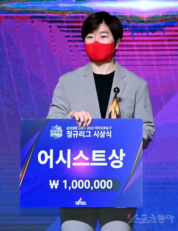 28일 서울 여의도 63컨벤션센터에서 열린 ‘삼성생명 2021-2022 여자프로농구’ 정규리그 시상식에 참석한 BNK 썸 안혜지가 어시스트상을 수상한 뒤 기념촬영을 하고 있다.