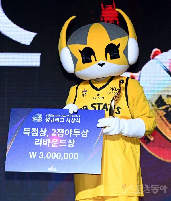 28일 서울 여의도 63컨벤션센터에서 열린 ‘삼성생명 2021-2022 여자프로농구’ 정규리그 시상식에 참석한 KB스타즈 박지수(대리수상 마스코트)가 득점상, 2점야투상, 리바운드상 수상한 뒤 기념촬영을 하고 있다.
