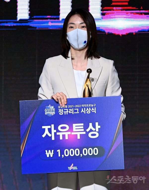 28일 서울 여의도 63컨벤션센터에서 열린 ‘삼성생명 2021-2022 여자프로농구’ 정규리그 시상식에 참석한 우리은행 박혜진이 자유투상을 수상한 뒤 기념촬영을 하고 있다.