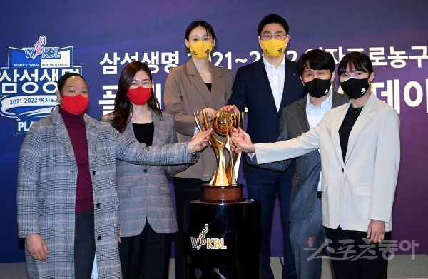 28일 서울 여의도 63컨벤션센터에서 열린 ‘삼성생명 2021-2022 여자프로농구’ 플레이오프 미디어데이에 참석한 BNK 썸 김한별(왼쪽부터), 박정은 감독, KB스타즈 강이슬, 김완수 감독, 우리은행 위성우 감독, 박지현이 카메라를 향해 포즈를 취하고 있다.