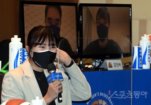 28일 서울 여의도 63컨벤션센터에서 열린 ‘삼성생명 2021-2022 여자프로농구’ 플레이오프 미디어데이에 참석한 우리은행 박지현이 신한은행에 대해 이야기하고 있다.
