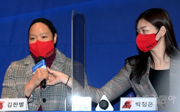 28일 서울 여의도 63컨벤션센터에서 열린 ‘삼성생명 2021-2022 여자프로농구’ 플레이오프 미디어데이에 참석한 BNK 썸 박정은 감독이 김한별의 인터뷰를 돕고 있다.
