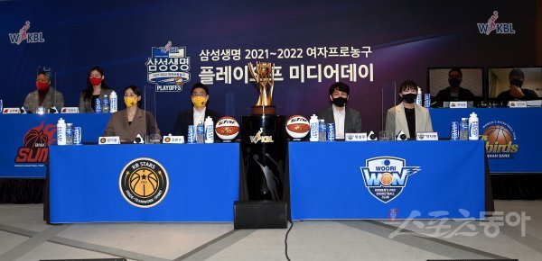 28일 서울 여의도 63컨벤션센터에서 열린 ‘삼성생명 2021-2022 여자프로농구’ 플레이오프 미디어데이에 참석한 4개 구단(BNK 썸, KB스타즈, 우리은행, 신한은행) 감독 및 대표선수들이 출사표를 밝히고 있다.
