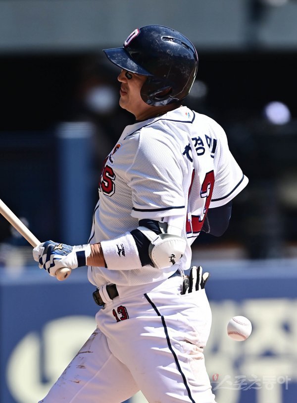 28일 서울 잠실야구장에서 열린 ‘2022 KBO 리그’ 두산 베어스와 NC 다이노스의 시범경기에서 2회말 1사 두산 허경민이 NC 투수의 투구를 맞고 있다.