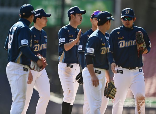 28일 서울 잠실야구장에서 열린 ‘2022 KBO 리그’ 두산 베어스와 NC 다이노스의 시범경기에서 두산과 4-4 무승부로 마친 NC 선수들이 서로를 격려하고 있다.