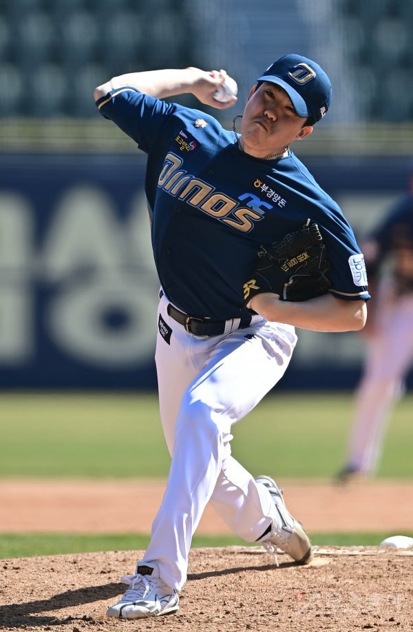 28일 서울 잠실야구장에서 열린 ‘2022 KBO 리그’ 두산 베어스와 NC 다이노스의 시범경기에서 7회말 NC 이우석이 교체로 마운드에 올라 역투하고 있다.