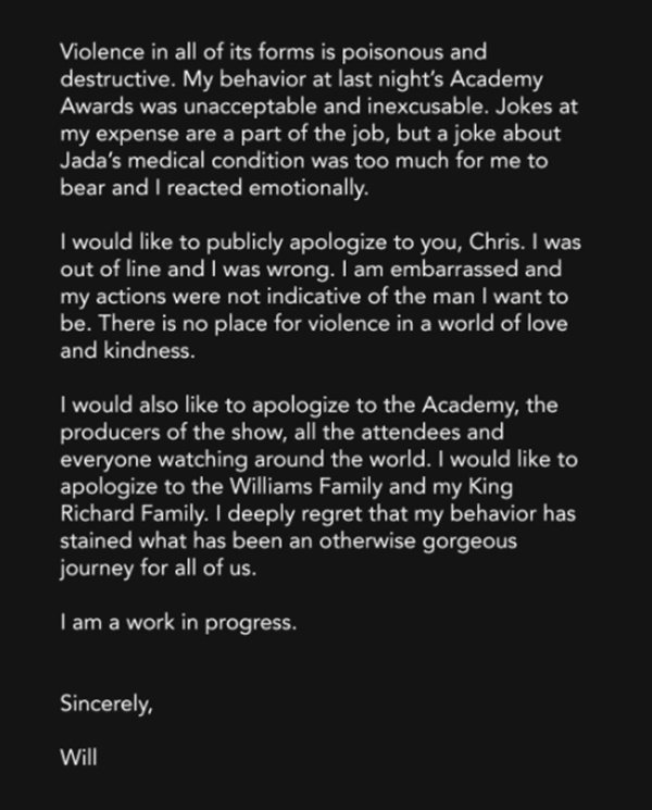 윌 스미스는 “나의 행동으로 인해 우리 모두를 위한 아름다운 여정을 더럽혀 매우 후회하고 있다”며 “나는 여전히 발전해야 하는 사람이다”라고 전했다.