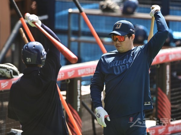 29일 서울 잠실야구장에서 열린 ‘2022 KBO 리그’ 두산 베어스와 NC 다이노스의 시범경기에 앞서 NC 양의지가 몸을 풀고 있다.