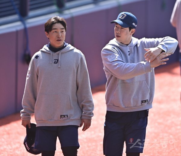 29일 서울 잠실야구장에서 열린 ‘2022 KBO 리그’ 두산 베어스와 NC 다이노스의 시범경기에 앞서 NC 손아섭과 박건우가 이야기를 하고 있다.