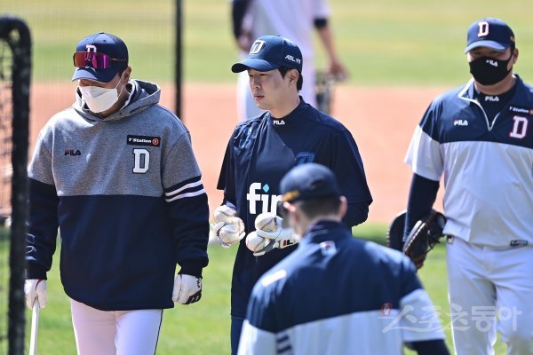 29일 서울 잠실야구장에서 열린 ‘2022 KBO 리그’ 두산 베어스와 NC 다이노스의 시범경기에 앞서 NC 박건우가 두산의 훈련 종료 후 볼을 정리하고 있다.