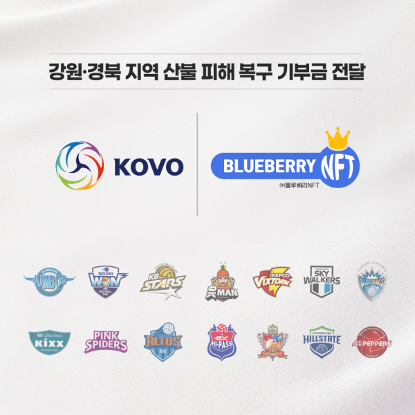 연맹은 V-리그 남녀부 14개 구단과 연맹 NFT(대체불가토큰) 사업권자 (주)블루베리NFT와 함께 강원-경북 지역산불 피해 복구를 위한 기부금을 지난 25일 재난구호모금 전문기관인 희망브리지 전국재해구호협회에 전달했다고 29일 전했다.