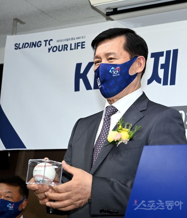 29일 서울 도곡동 KBO 야구회관에서 열린 ‘KBO 제 24대 허구연 총재 취임식’에 참석한 허구연 신임 총재가 자신의 이름이 새겨진 공인구를 들고 포즈를 취하고 있다.