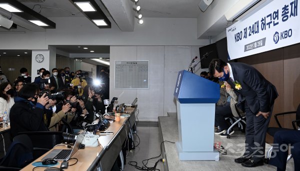 29일 서울 도곡동 KBO 야구회관에서 열린 ‘KBO 제 24대 허구연 총재 취임식’에 참석한 허구연 신임 총재가 인사를 하고 있다.