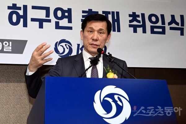 29일 서울 도곡동 KBO 야구회관에서 열린 ‘KBO 제 24대 허구연 총재 취임식’에 참석한 허구연 신임 총재가 취임사를 밝히고 있다.