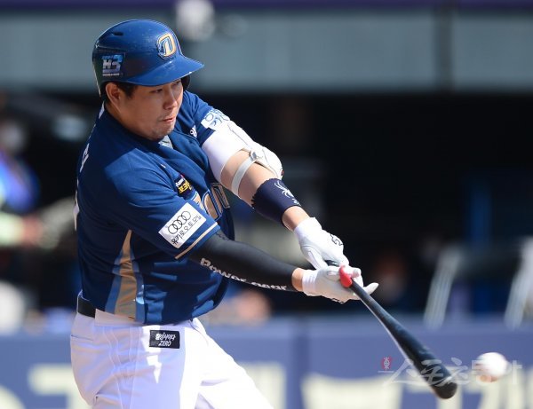 29일 서울 잠실야구장에서 열린 ‘2022 KBO 리그’ 두산 베어스와 NC 다이노스의 시범경기에서 5회초 2사 1, 2루 NC 양의지가 1타점 좌전 적시타를 치고 있다.