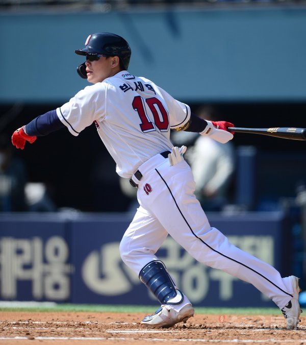 29일 서울 잠실야구장에서 열린 ‘2022 KBO 리그’ 두산 베어스와 NC 다이노스의 시범경기에서 4회말 2사 2루 두산 박세혁이 1타점 좌전 적시타를 치고 있다.
