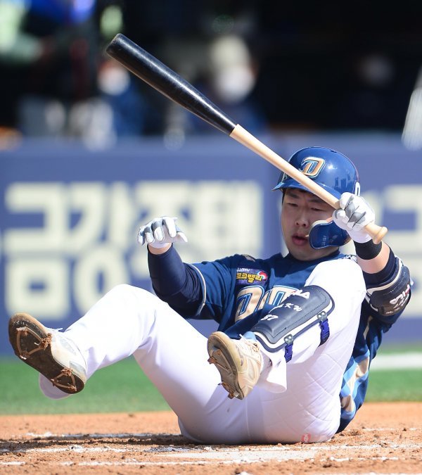 29일 서울 잠실야구장에서 열린 ‘2022 KBO 리그’ 두산 베어스와 NC 다이노스의 시범경기에서 6회초 1사 만루 NC 박건우가 몸쪽 공을 피하며 넘어지고 있다.