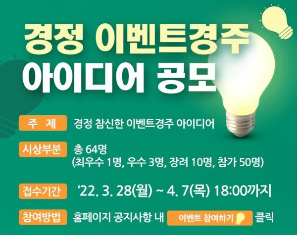 국민체육진흥공단(이사장 조현재) 경주사업총괄본부는 4월7일까지 ‘경정 이벤트 경주 아이디어 공모’를 한다. 경륜경정 온라인 발매인 스피드온(Speed-On) 또는 홈페이지를 통해 참여할 수 있다. 경주 명칭, 경주 진행 방법 등을 작성해 제출하면 된다. 최종 64명을 선정해 스피드온에서 사용할 수 있는 마일리지를 지급한다.