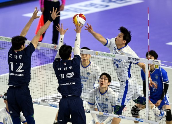 29일 인천 계양체육관에서 ‘2021-2022 도드람 V리그’ 인천 대한항공과 대전 삼성화재의 남자부 경기가 열렸다. 삼성화재 정수용이 대한항공 블로커를 피해 공격을 펼치고 있다.