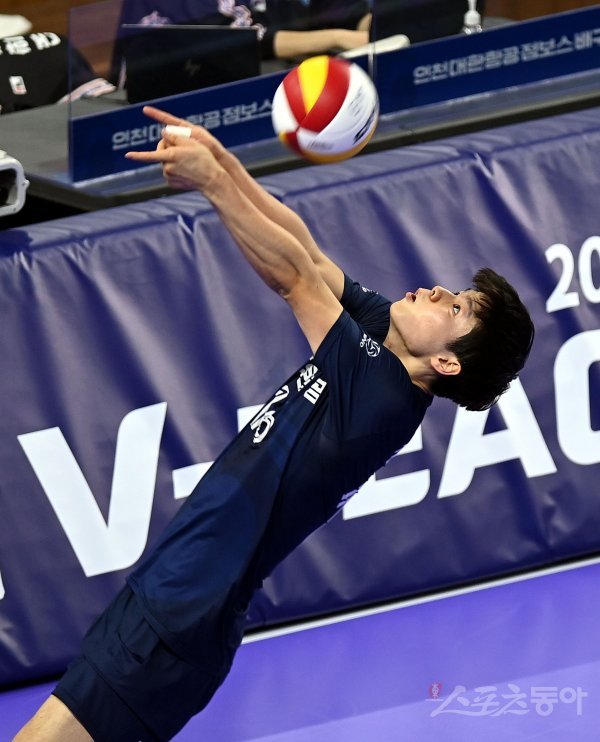 29일 인천 계양체육관에서 ‘2021-2022 도드람 V리그’ 인천 대한항공과 대전 삼성화재의 남자부 경기가 열렸다. 대한항공 정한용이 수비를 펼치고 있다.