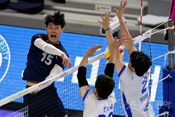 29일 인천 계양체육관에서 ‘2021-2022 도드람 V리그’ 인천 대한항공과 대전 삼성화재의 남자부 경기가 열렸다. 대한항공 임재영이 삼성화재 블로커를 피해 스파이크를 날리고 있다.