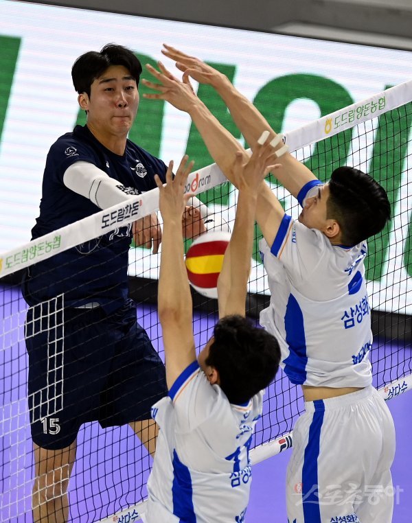 29일 인천 계양체육관에서 ‘2021-2022 도드람 V리그’ 인천 대한항공과 대전 삼성화재의 남자부 경기가 열렸다. 대한항공 임재영이 삼성화재 블로커를 피해 스파이크를 날리고 있다.