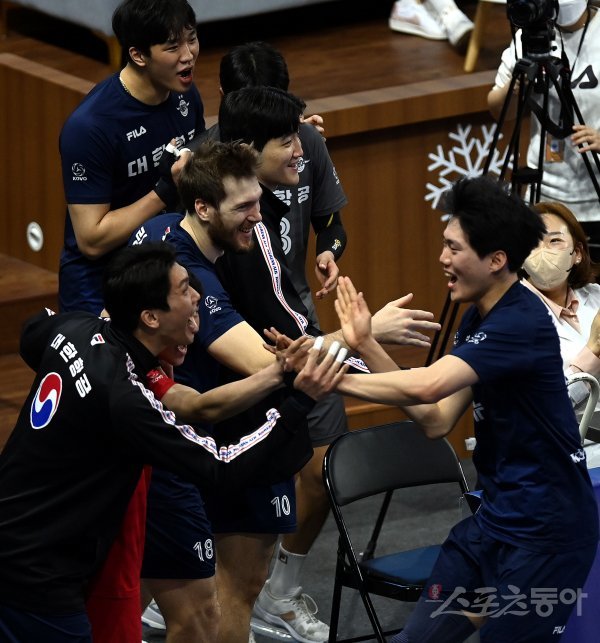 29일 인천 계양체육관에서 ‘2021-2022 도드람 V리그’ 인천 대한항공과 대전 삼성화재의 남자부 경기가 열렸다. 대한항공 김민재가 득점을 올린 후 웜업존의 동료들과 기쁨을 나누고 있다.