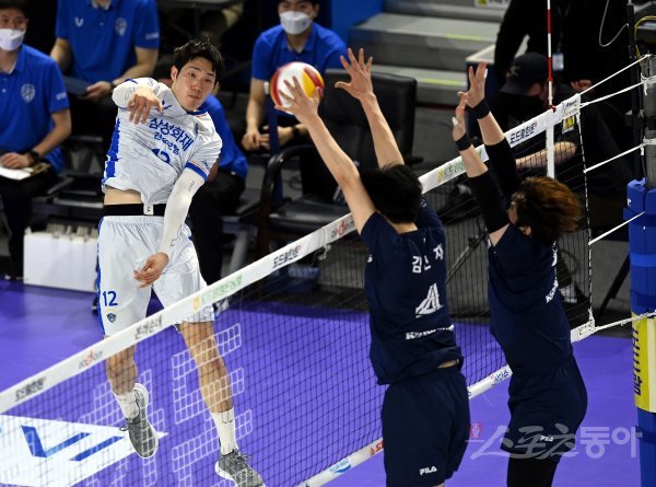29일 인천 계양체육관에서 ‘2021-2022 도드람 V리그’ 인천 대한항공과 대전 삼성화재의 남자부 경기가 열렸다. 삼성화재 황경민이 대한항공 블로커를 피해 스파이크를 날리고 있다.