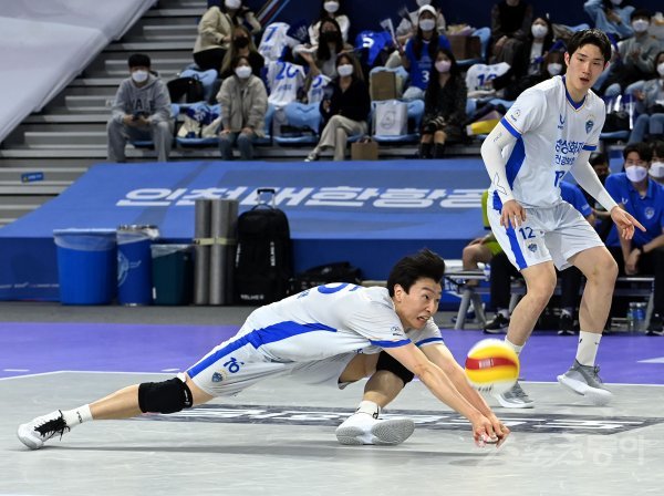 29일 인천 계양체육관에서 ‘2021-2022 도드람 V리그’ 인천 대한항공과 대전 삼성화재의 남자부 경기가 열렸다. 삼성화재 정성규가 수비를 펼치고 있다.