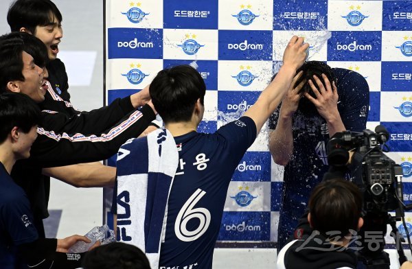 29일 인천 계양체육관에서 ‘2021-2022 도드람 V리그’ 인천 대한항공과 대전 삼성화재의 남자부 경기가 열렸다. 대한항공이 삼성화재를 상대로 세트 스코어 3-2로 승리한 뒤 김민재가 인터뷰도중 동료들의 물세례를 받고 있다.