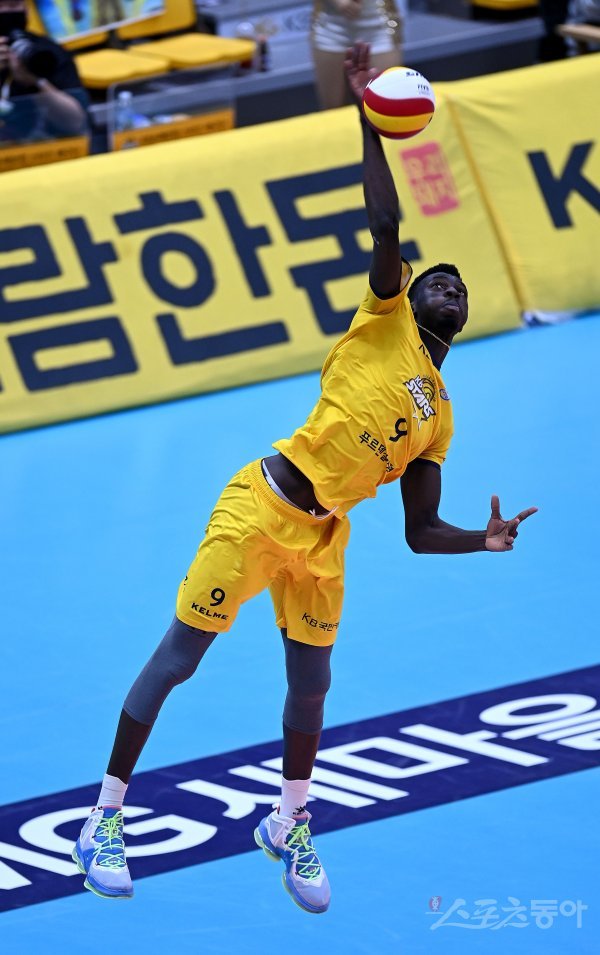 30일 의정부체육관에서 열린 ‘2021~2022 도드람 V-리그’ 남자부 KB손해보험과 한국전력 경기에서 KB손배보험 케이타가 서브를 넣고 있다.