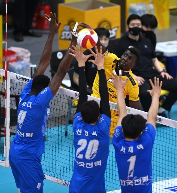 30일 의정부체육관에서 열린 ‘2021~2022 도드람 V-리그’ 남자부 KB손해보험과 한국전력 경기에서 KB손배보험 케이타가 한국전력의 블로킹 사이로 스파이크를 날리고 있다.
