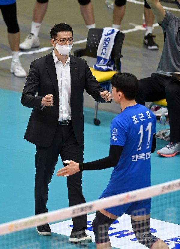 30일 의정부체육관에서 열린 ‘2021~2022 도드람 V-리그’ 남자부 KB손해보험과 한국전력 경기에서 한국전력 장병철 감독이 팀 득점에 주먹을 쥐고 있다.
