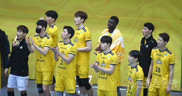 30일 의정부체육관에서 열린 ‘2021~2022 도드람 V-리그’ 남자부 KB손해보험과 한국전력 경기 3세트 KB손해보험 주전 선수들이 교체되어 웜업존에서 경기를 바라보고 있다.