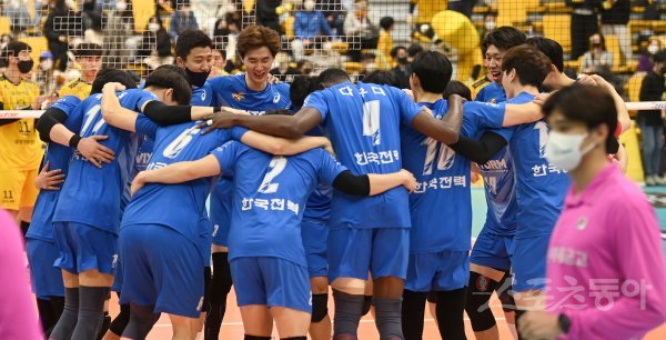 30일 의정부체육관에서 열린 ‘2021~2022 도드람 V-리그’ 남자부 KB손해보험과 한국전력 경기에서 세트스코어 3-1 승리를 거두며 포스트시즌 진출을 확정지은 한국전력 선수들이 기뻐하고 있다.