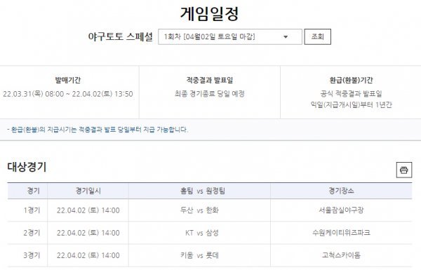 31일(목) 오전 8시부터 발매를 시작한 1회차의 경우 경기시작 10분 전인 4월 2일(토) 오후 1시50분까지 게임에 참여할 수 있다. 공식 결과는 경기가 모두 종료된 뒤 발표된다.