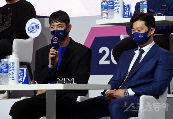 31일 서울 그랜드 하얏트호텔에서 ‘2022 신한은행 SOL KBO리그’ 미디어데이가 열렸다. 삼성 구자욱이 오승환과 함께 취재진의 질문에 답하고 있다.