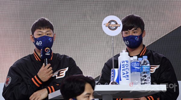 31일 서울 그랜드 하얏트호텔에서 ‘2022 신한은행 SOL KBO리그’ 미디어데이가 열렸다. 한화 하주석이 노시환과 함께 취재진의 질문에 답하고 있다.