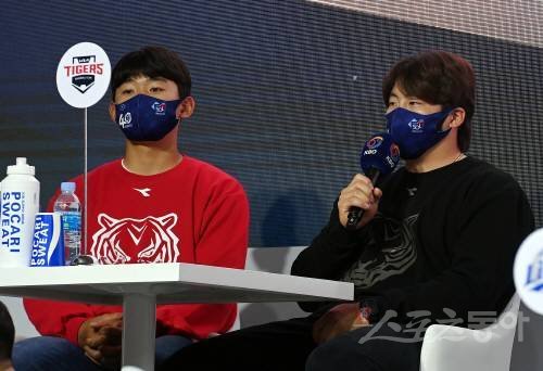 31일 서울 그랜드 하얏트호텔에서 ‘2022 신한은행 SOL KBO리그’ 미디어데이가 열렸다. KIA 나성범이 김도영과 함께 취재진의 질문에 답하고 있다.