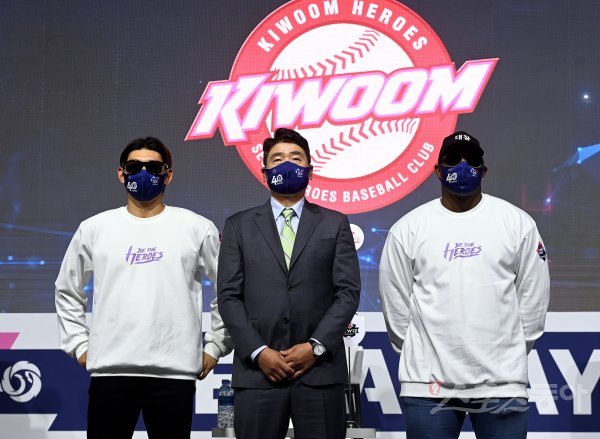 31일 서울 그랜드 하얏트호텔에서 ‘2022 신한은행 SOL KBO리그’ 미디어데이가 열렸다. 지난 시즌 5위팀 키움 이정후, 홍원기 감독, 푸이그가 포즈를 취하고 있다.
