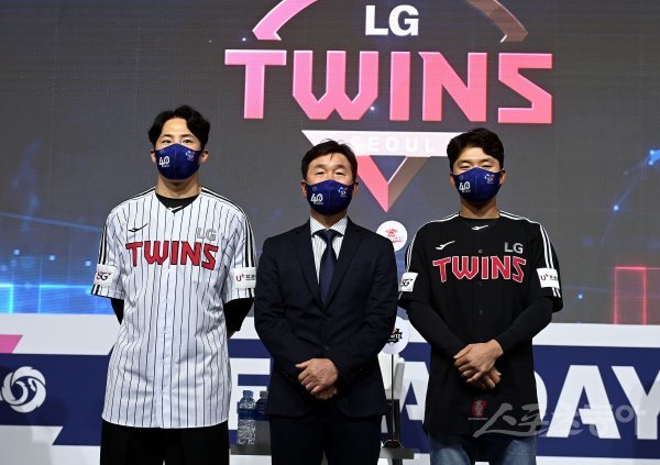 31일 서울 그랜드 하얏트호텔에서 ‘2022 신한은행 SOL KBO리그’ 미디어데이가 열렸다. 지난 시즌 4위팀 LG 임찬규, 류지현 감독, 박해민이 포즈를 취하고 있다.