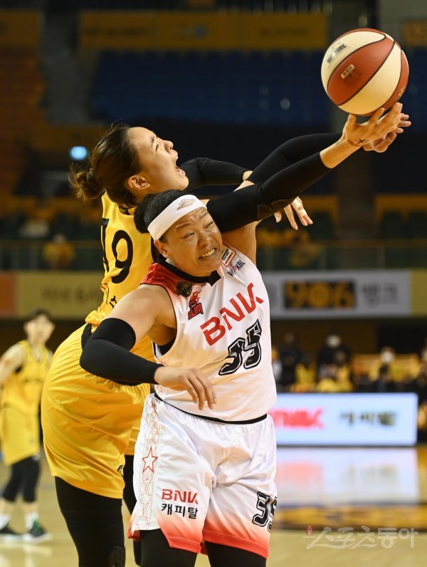 31일 충북 청주체육관에서 열린 ‘삼성생명 2021-2022 여자프로농구’ 청주 KB와 부산 BNK 썸의 플레이오프 1차전 경기에서 KB 박지수와 BNK 김한별이 리바운드 경합을 하고 있다.