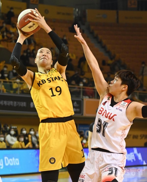 31일 충북 청주체육관에서 열린 ‘삼성생명 2021-2022 여자프로농구’ 청주 KB와 부산 BNK 썸의 플레이오프 1차전 경기에서 KB 박지수가 BNK 진안의 앞에서 슛을 하고 있다.