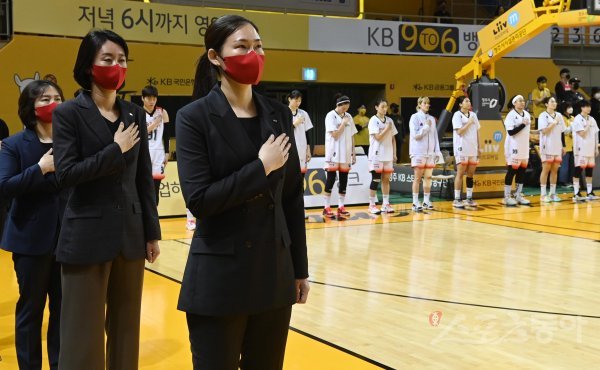 31일 충북 청주체육관에서 열린 ‘삼성생명 2021-2022 여자프로농구’ 청주 KB와 부산 BNK 썸의 플레이오프 1차전 경기에 앞서 BNK 박정은 감독이 애국가 제창을 하고 있다.