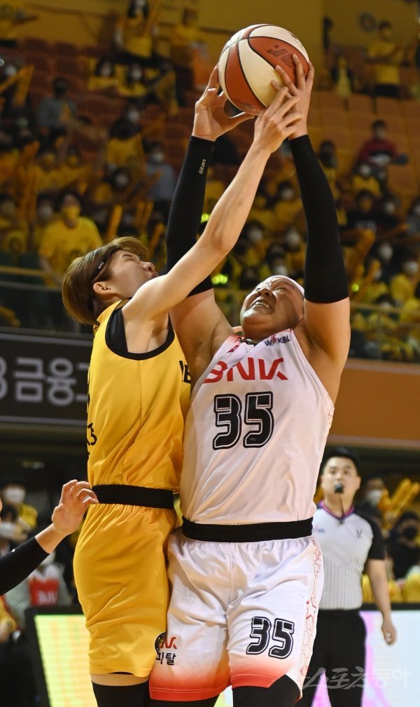 31일 충북 청주체육관에서 열린 ‘삼성생명 2021-2022 여자프로농구’ 청주 KB와 부산 BNK 썸의 플레이오프 1차전 경기에서 BNK 김한별이 리바운드 볼을 잡고 있다.