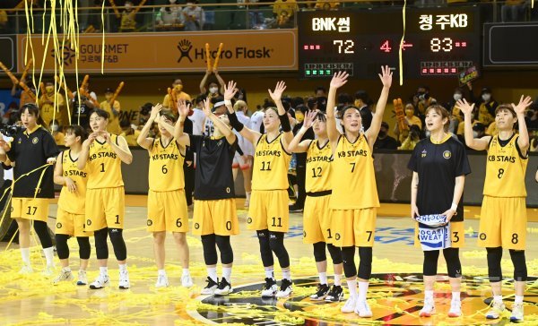 31일 충북 청주체육관에서 열린 ‘삼성생명 2021-2022 여자프로농구’ 청주 KB와 부산 BNK 썸의 플레이오프 1차전 경기에서 BNK에 83-72로 승리한 KB 선수들이 관중들에게 인사하고 있다.